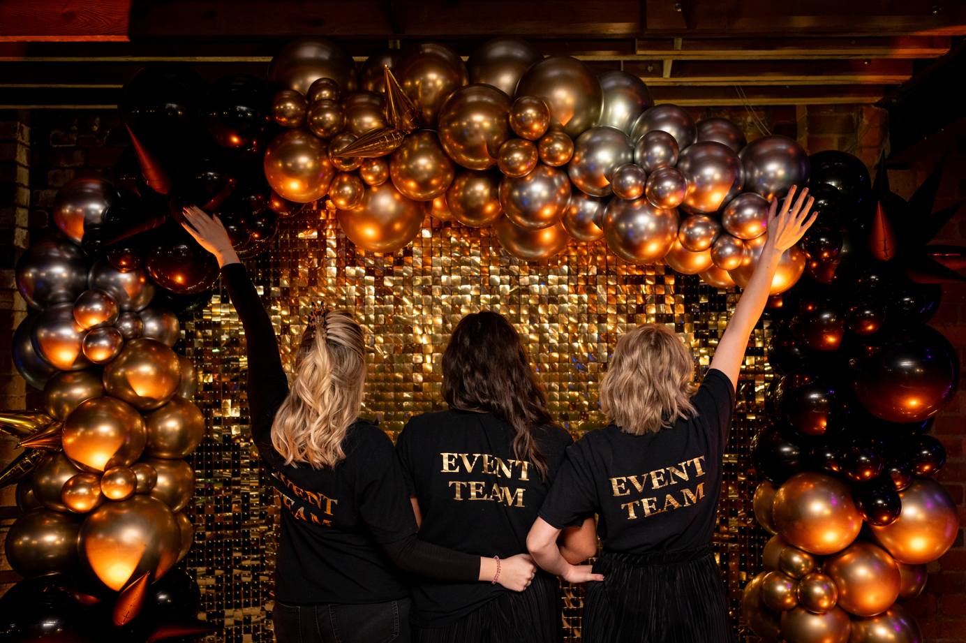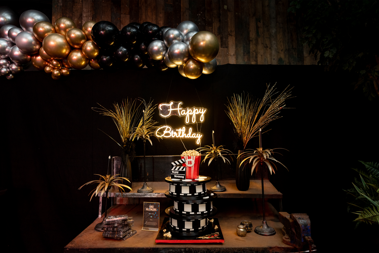 A fabulous event of full concept creation, held in a venue with the most incredible vibe, themed with black and gold elements, bespoke movie posters, and stunning balloon displays!